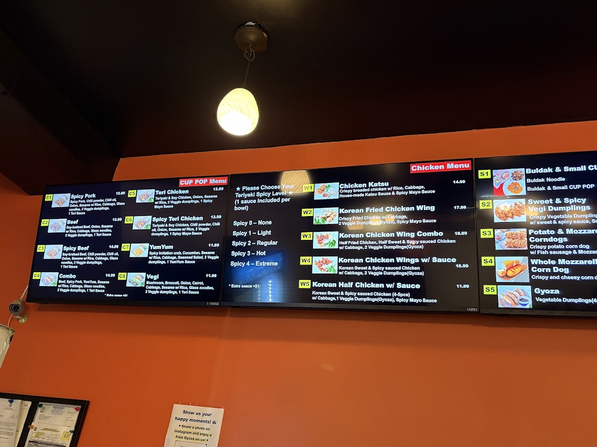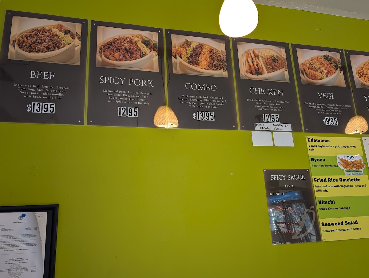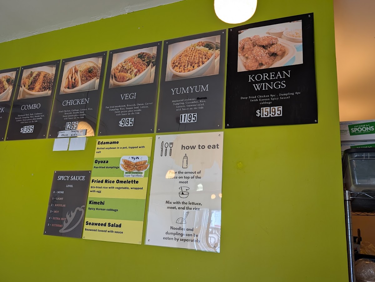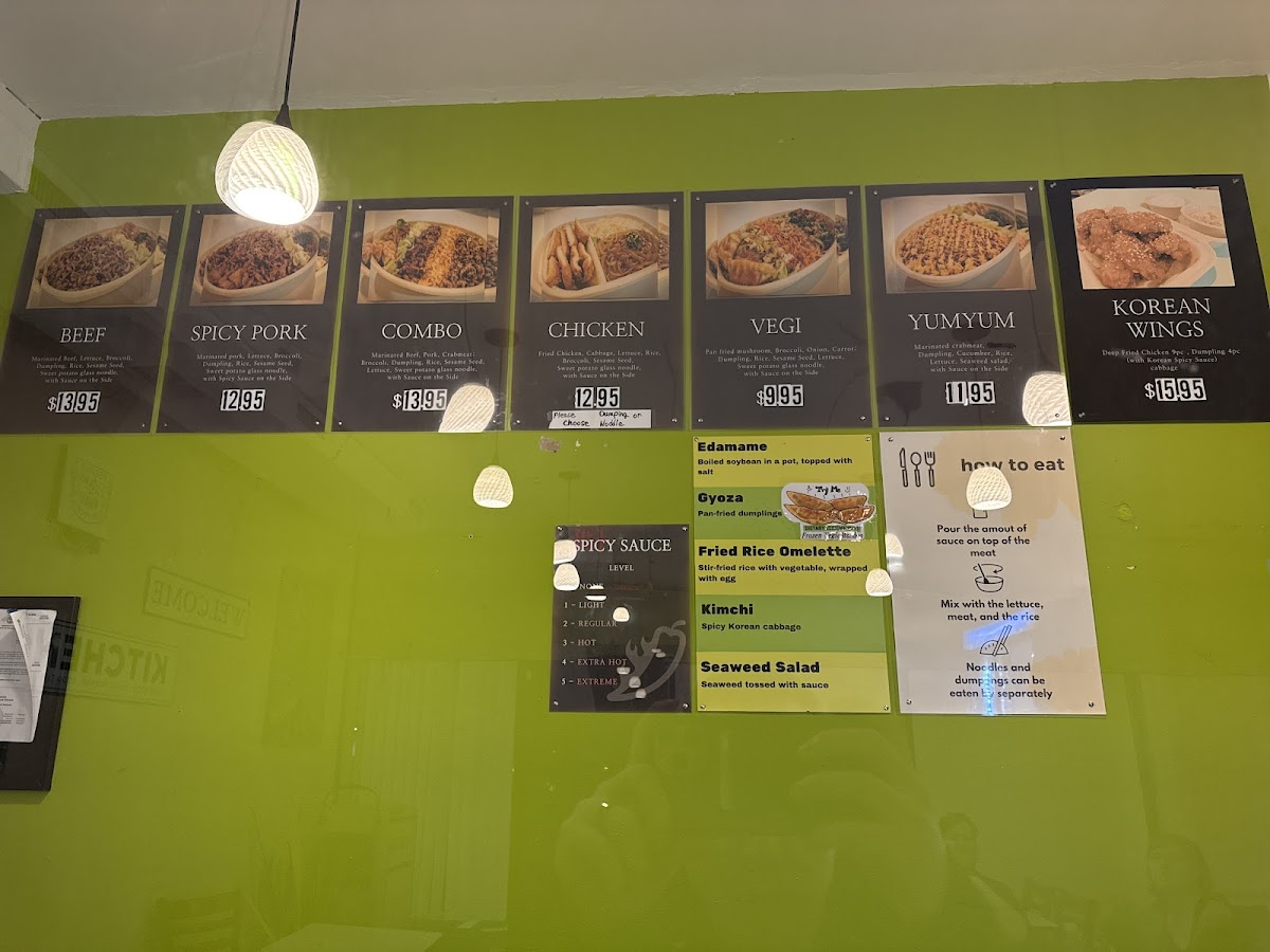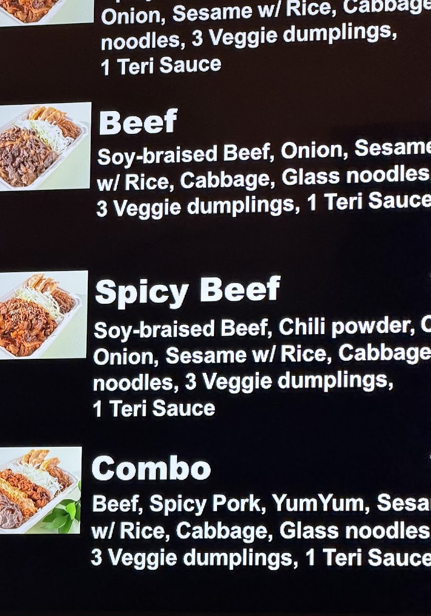 Beef, Spicy Pork, YumYum, Sesame w/ Rice, Cabbage, Glass noodles, 3 Veggie dumplings