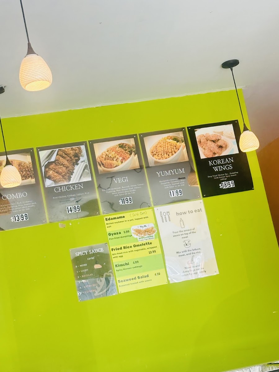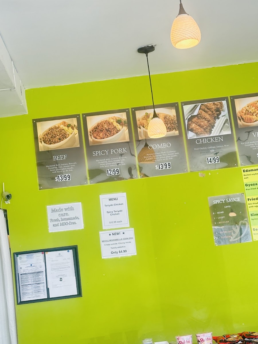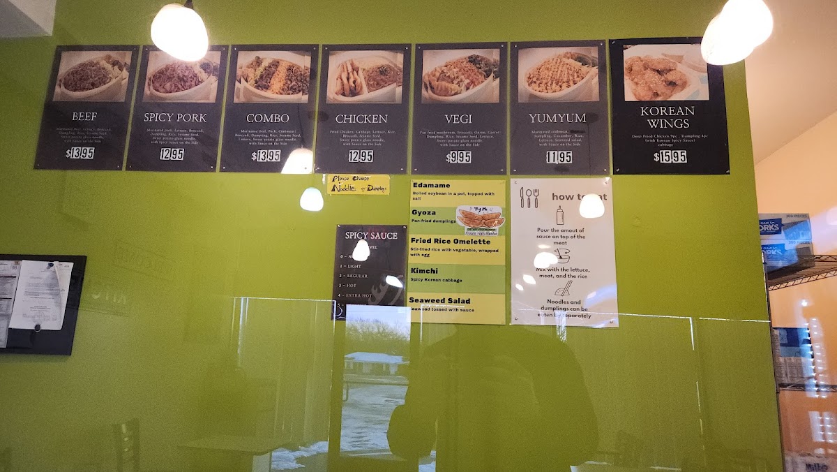 Beef, Chili powder, Onion, Sesame w/ Rice, Cabbage, Glass noodles, 3 Veggie dumplings